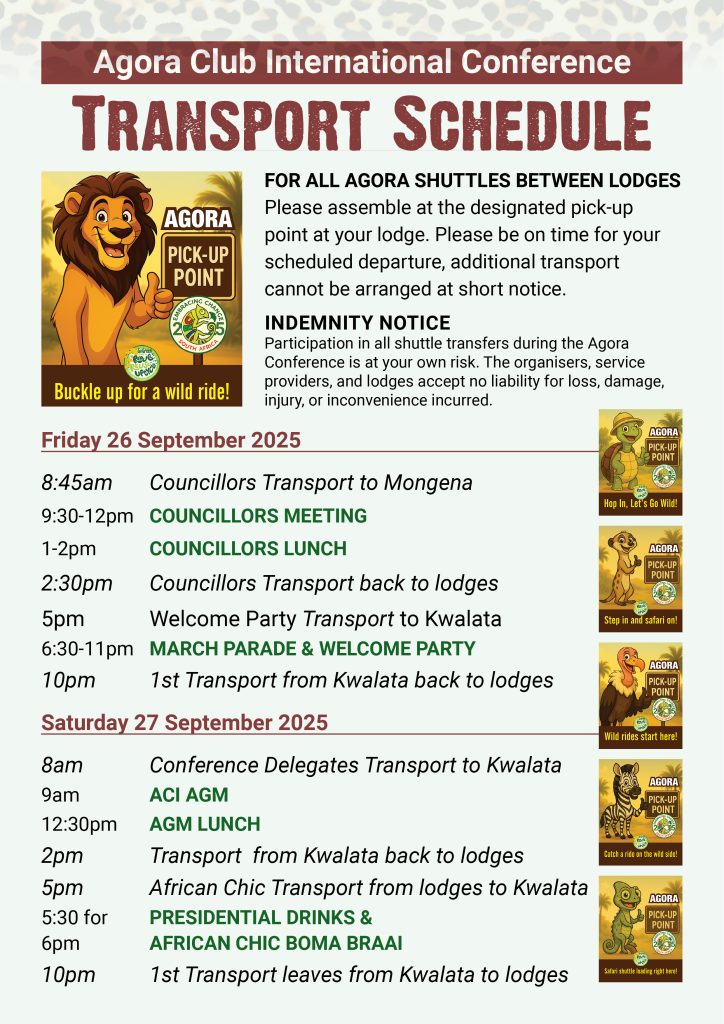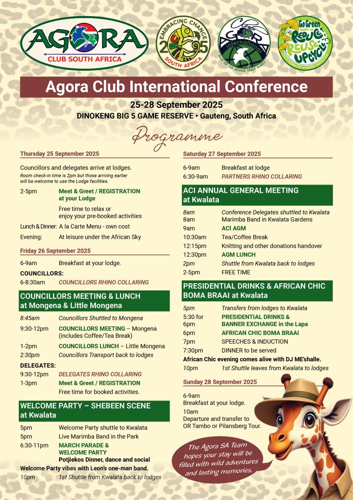 Agora Club InternationalDelegates Information and Live Updates The Conference Committee welcomes you to the ACI Conference 2025 in Dinokeng, South Africa. We are looking forward to meeting you! Let's Talk Now